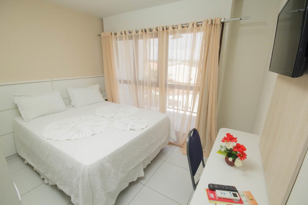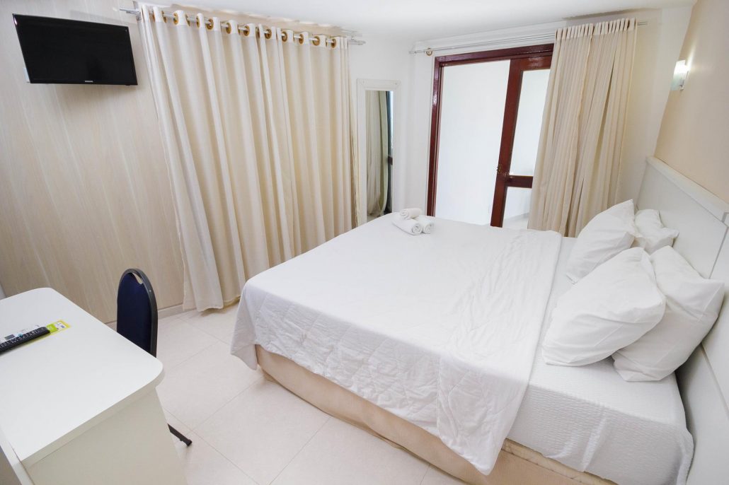 Cama box, Ar condicionado, Telefone, TV, Frigobar, Corrente elétrica de 220 volts, Internet wireless com acesso gratuito, Chuveiro quente, Secador de Cabelo.